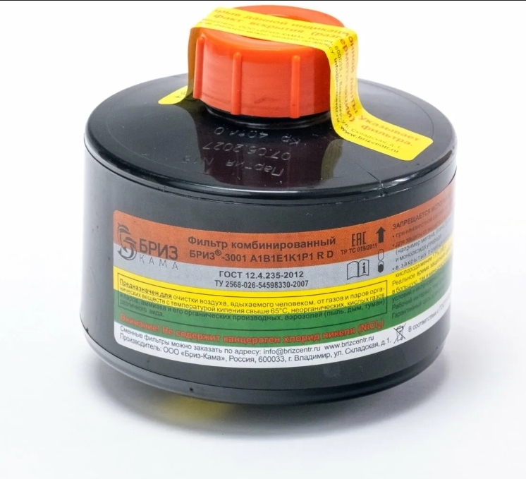 Фильтр комбинированный «БРИЗ®-3001» A1B1E1K1HgP3 R D применяется для очистки вдыхаемого воздуха от: